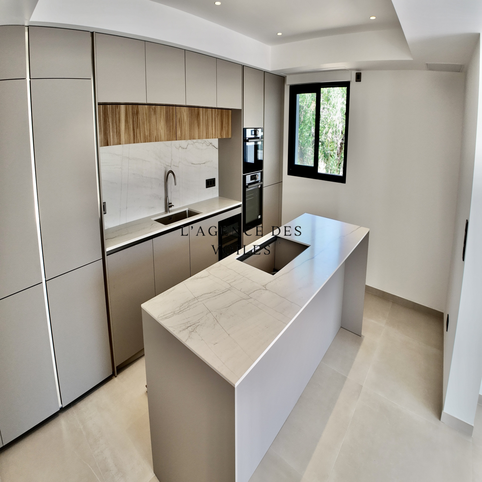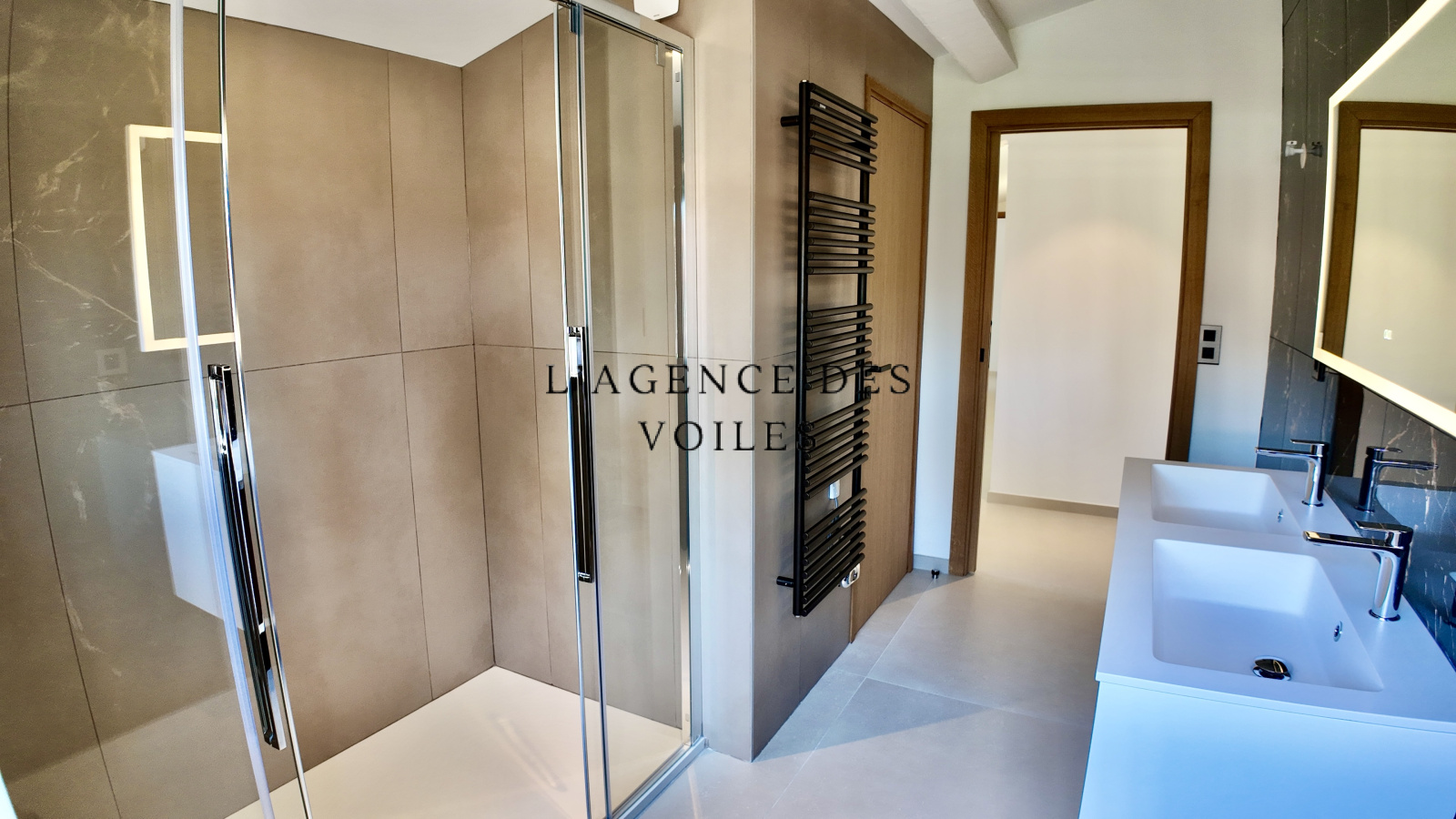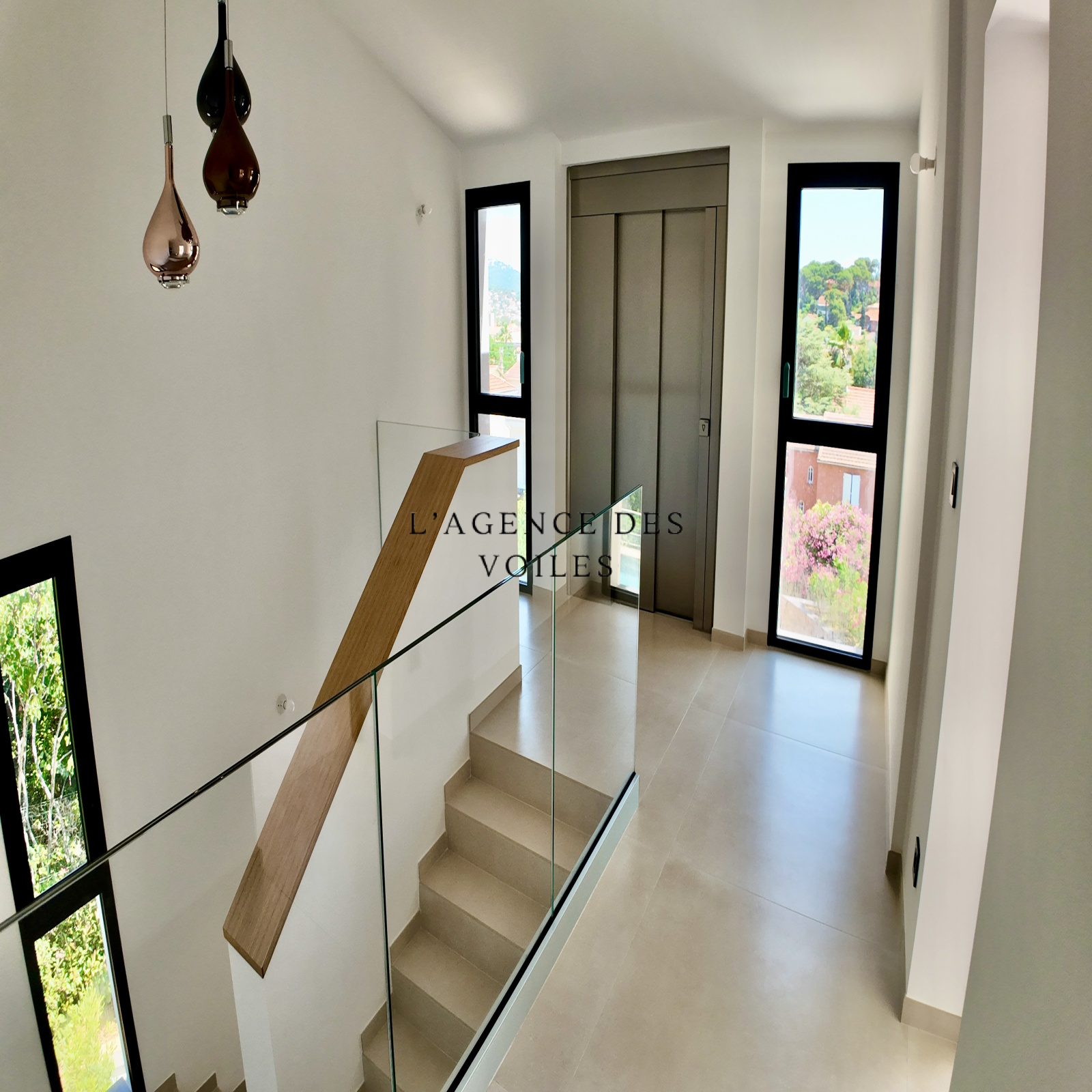 Villa contemporaine sur trois niveaux avec ascenseur. Au rez-de-chausée vous trouverez un garage de 30m2, une buanderie et une agréable cuisine d'été donnant sur sa piscine et sa grande terrasse de plus de 112m2. Au premier étage, une cuisine moderne équipée et un salon/séjour lumineux donnant sur une terrasse de 46m2. Une chambre avec salle d'eau et un WC indépendant complètent ce niveau. Au dernier étage, le côté nuit, deux belles suites parentales avec dressing sur mesure et terrasse, dont la master bedroom avec aperçu mer.